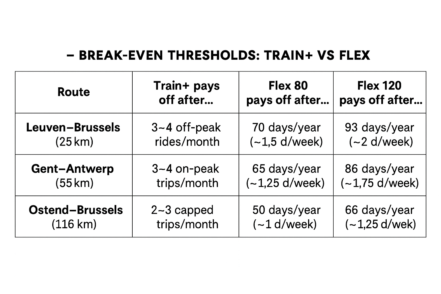 For medium distances like Gent–Antwerp, the Flex 80 becomes cheaper than individual tickets from around sixty-five travel days per year.